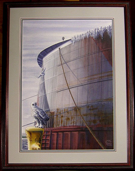 Yes, winter's here, indeed, and so are the M/V Edwin H. Gott and the snowy owls. The owls, one sitting and the other circling up high near the Gott's bow, have come down from the Arctic in search of food, a sign that the rodent population must be down in that region. The 1004' Gott of the Great Lakes Fleet, is wintering here in Duluth, MN at the Port Terminal and is already preparing for the coming shipping season.