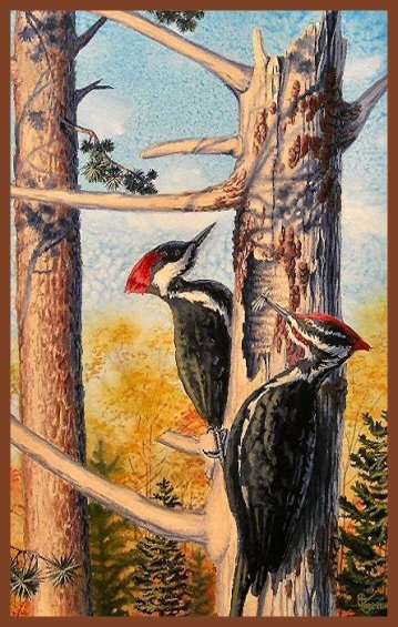 (23.5x16.5 in.) $900.00 A pair of adult pileated woodpeckers are at what they do best on a warm, October afternoon. Boring huge, oval or oblong shaped cavities in standing trees then leaving huge piles of wood chips beneath the trees are their standard trademark in search for food or building a nest site. The adult males sport the red “moustache” and both male and female show the red crest with the male’s being larger, extending all the way to the forehead. These 2 were part of a family of four, even the offspring looked like miniature adults with their characteristic red crests. |