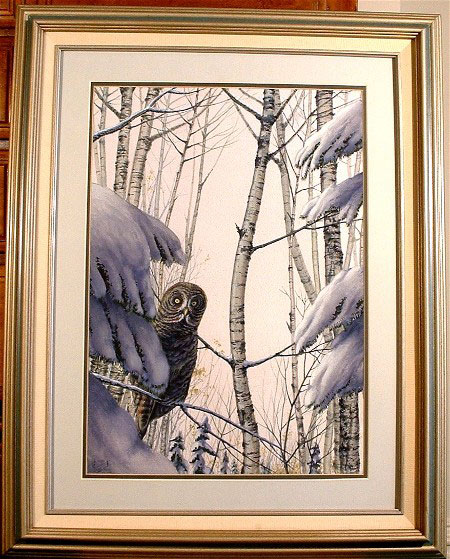 Heavy snow has fallen in northeastern Minnesota during the first week of October as a most silent and efficient predator, a great gray owl, is playing 'peek-a-boo' with me from behind a sagging balsam bough. The enormous great gray, largest in the owl family, is quietly, patiently waiting for his next meal, being nearly completely motionless except for slight head movements.