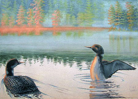 The early morning July sun is cutting its way through the mist that blankets Eagle's Nest Lake in northeastern Minnesota. A pair of common loons seems to greet the new day with a heralding of "loon talk," keeping each other company with shrill babblings that are almost comical at times. Their "conversation" with one another began at opposite ends of the lake, finally brining the two together within mere feet of each other through a series of yodels, yelps and low moaning calls.