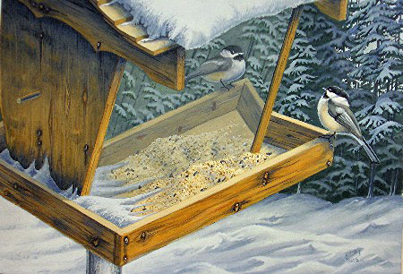 This black-capped chickadee seemed to be entranced with his reflected image on the glass of our birdfeeder. He may have thought the likeness was that of another, companion chickadee or may have just been impressed with his own reflection. If it were the latter, he may have been saying to himself, "Mirror, mirror on the feeder, who's the fairest one indeed(er)?" To which he would've answered, "Why me, of course!" On Christmas Day 2005, the aerial acrobat must've flown from the feeder to a nearby tree at least a dozen times. On each trip he carried out exactly the same procedure: after landing on the feeder he would look at his image for a short time, then pick up a single sunflower seed, fly to the tree where he would place the seed between his feet and hammer at the seed with his beak until he cracked it open.