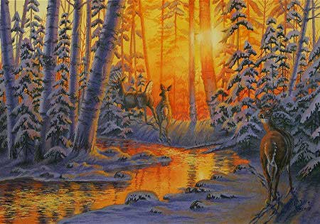 Nicholson Creek Back in 1986 and 2 days before Christmas, newly fallen snow covered the heavily forested area near Nicholson Creek of northeastern Minnesota. Approaching the location by snowmobile, we came across 3 whitetail deer alongside the creek. The buck saw us first and was off to the races with a doe not far behind. The second doe was much more curious, not bolting until the very last. |