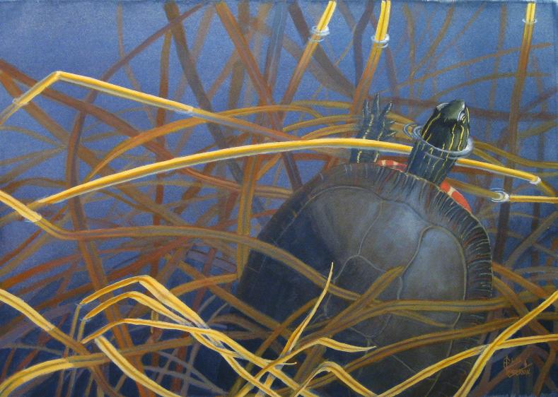 Reminiscent of a WW II submarine, this painted turtle has risen to periscope depth, exposing only the tip of his head as he surveys the surroundings of Lake Hayward on the Namekagon River of northwestern Wisconsin. It is March 2012 and generally the lake has 2 feet of ice on it at this time but an early spring has the turtles out and about as if it were mid summer.